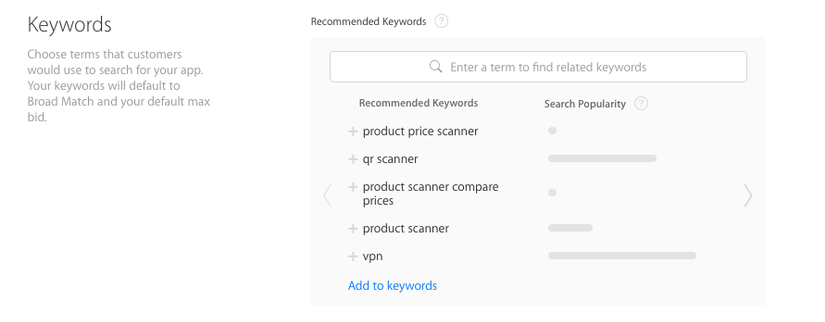 Searching Good keywords is really a difficult challenge. How to choose the right keyword which is good, has less competition, has a good search frequency. Fortunately, there are now many tools that can help you find the right keywords for your keyword list and your app name, analyze the keyword of adversary and the keyword search frequency. Because I do not have money to invest in these services, I also find some free ways, which ensure good enough and reliable, to analyze the keyword. It’s Apple and Google’s own advertising services. Before placing adsvertisings on the Apple Store or Play Store, Apple and Google will let us learn about the keyword to choose for accuracy. Exploiting this, you can also use it to analyze. A small note is that Apple or other analytical services, searching for keywords in the Apple Store only within the US and recently more Spain, Canada and some another countries. The reason is that Apple currently only provides public APIs in these countries. If you only intend to distribute the application in Vietnam, you should find other tips elsewhere. In the image below, we analyze the keyword’s search frequency on the Apple Store and Google Search. You can visit this site for details